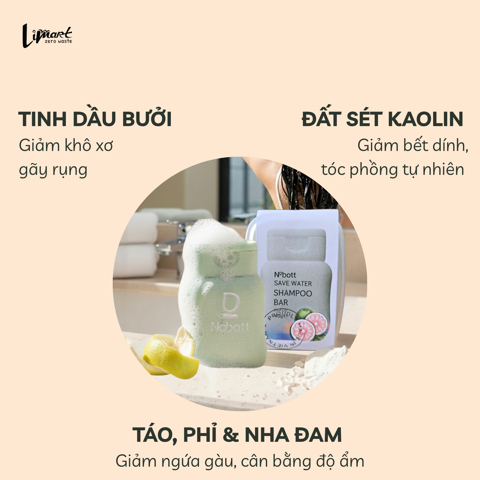 Bánh gội Nobott Save Water – Vỏ Bưởi Hòa Bình làm sạch da đầu và hỗ trợ giảm gàu – giảm ngứa – giảm bết dính nhờ sự kết hợp giữa đất sét Kaolin và các hoạt chất làm sạch dịu nhẹ có nguồn gốc từ dừa.