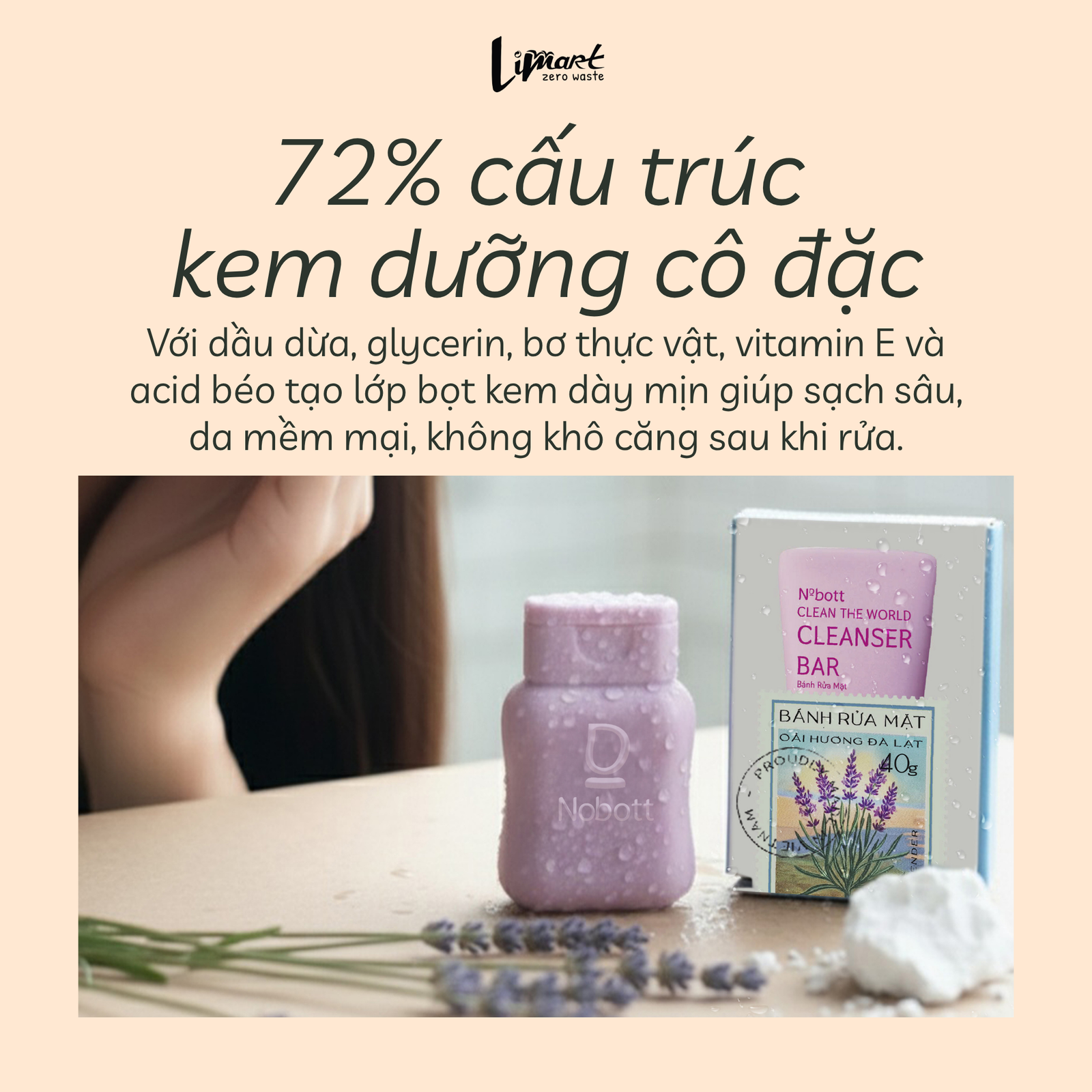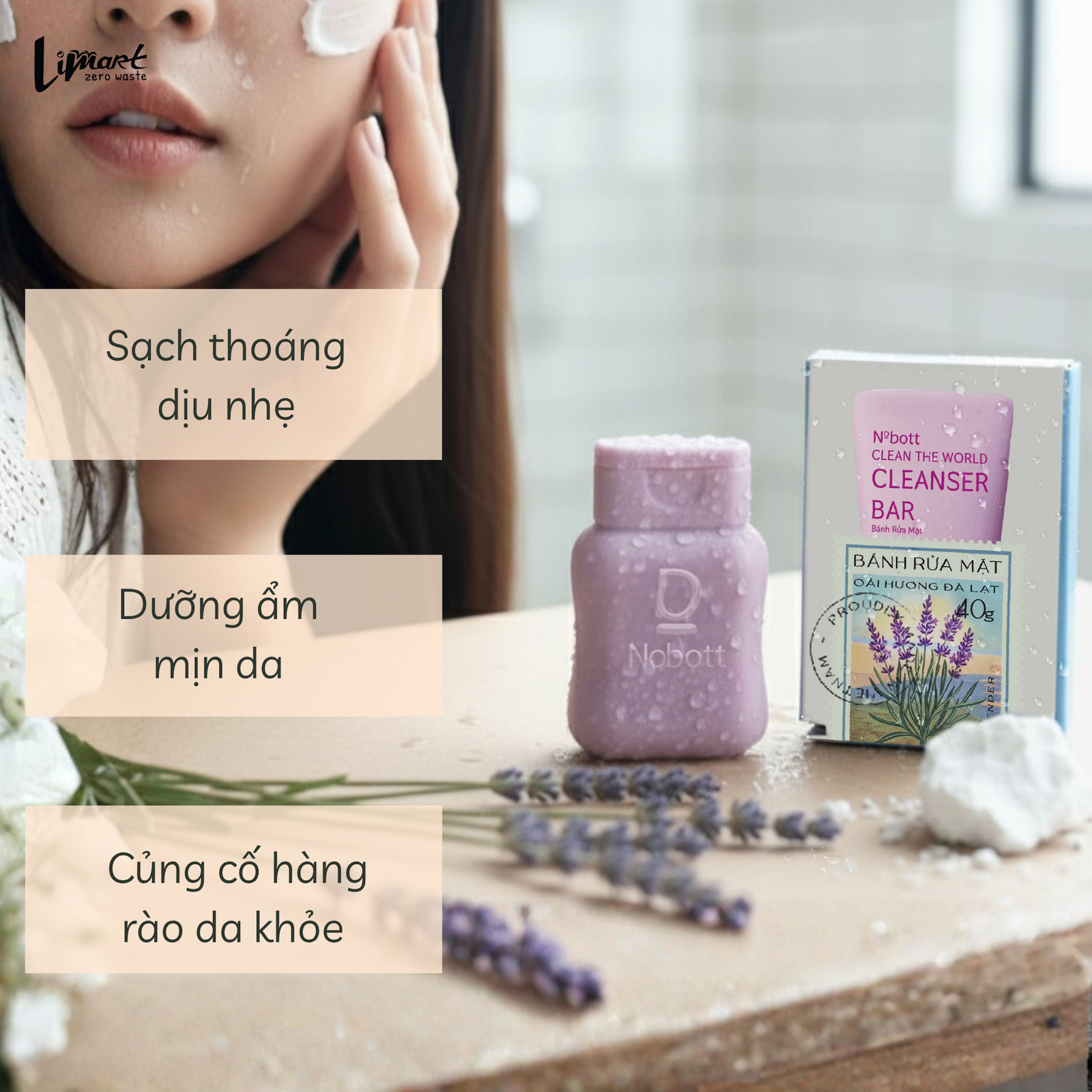 Bánh Rửa Mặt Nobott Clean The World – Oải Hương Đà Lạt là giải pháp làm sạch da xanh, dạng bánh cô đặc không chứa xà phòng, thân thiện với môi trường và an toàn cho làn da.