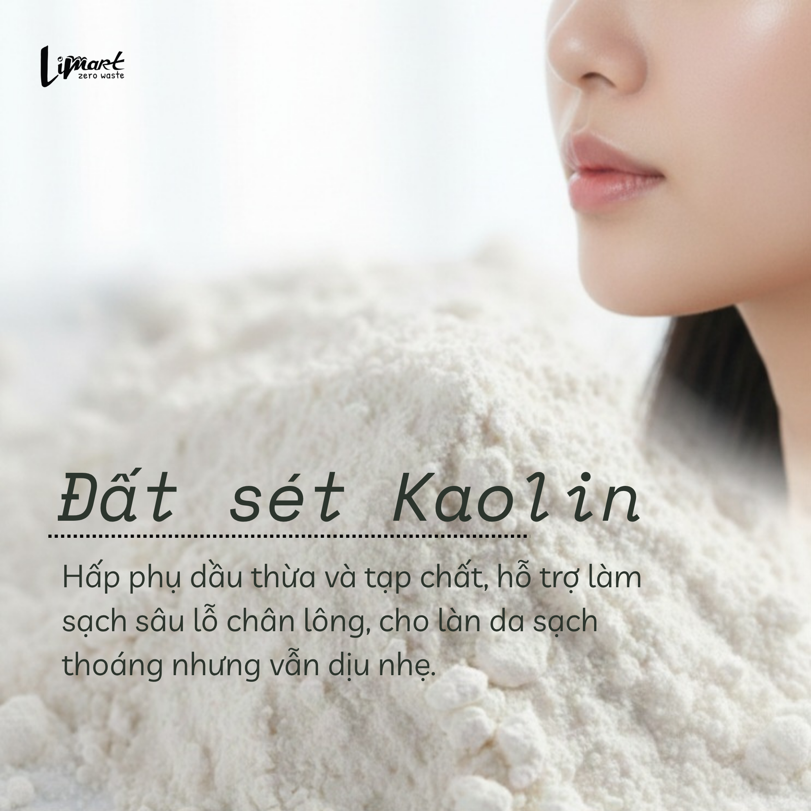 Đất sét Kaolin: Hấp phụ dầu thừa và tạp chất, hỗ trợ làm sạch sâu lỗ chân lông, giúp da sạch thoáng nhưng vẫn dịu nhẹ