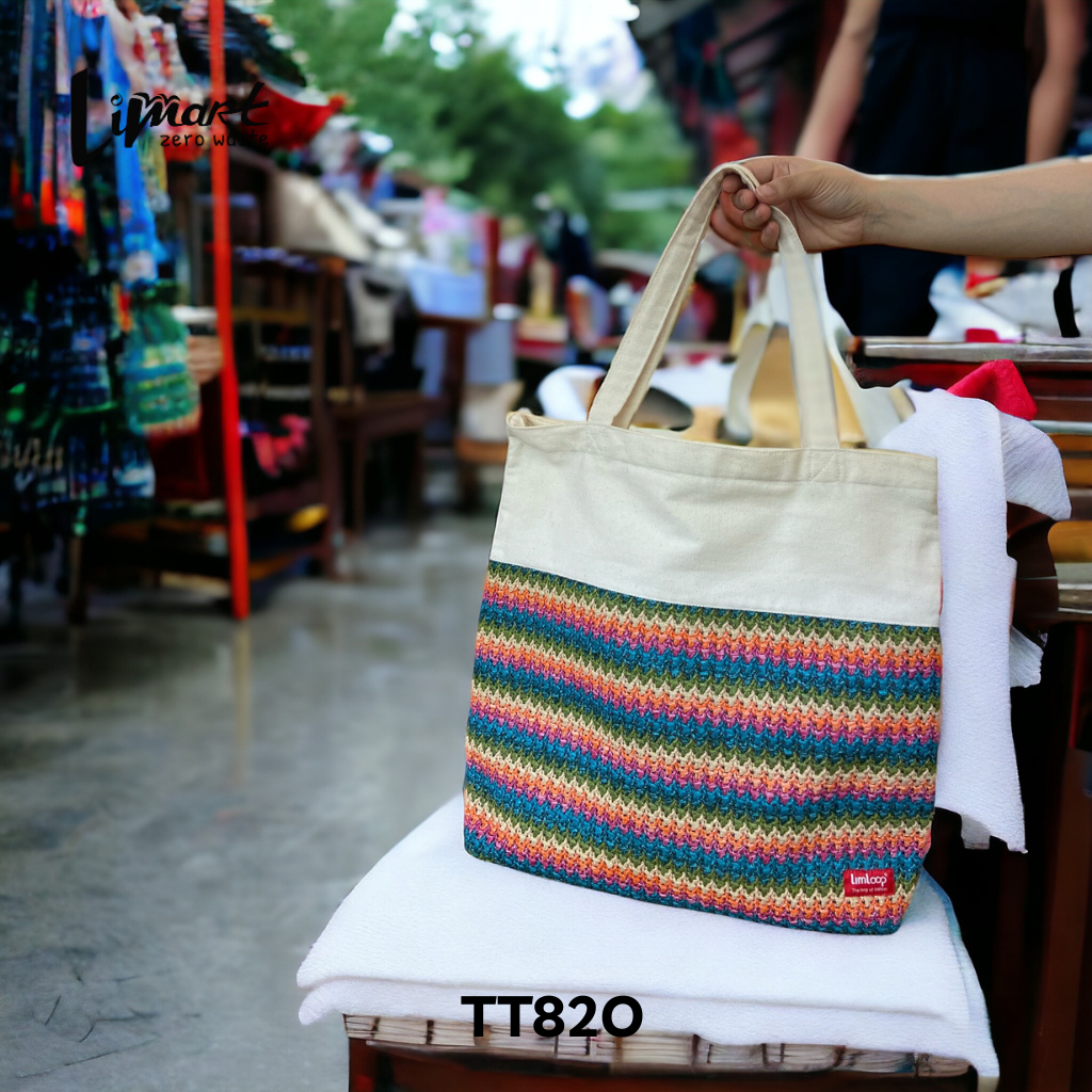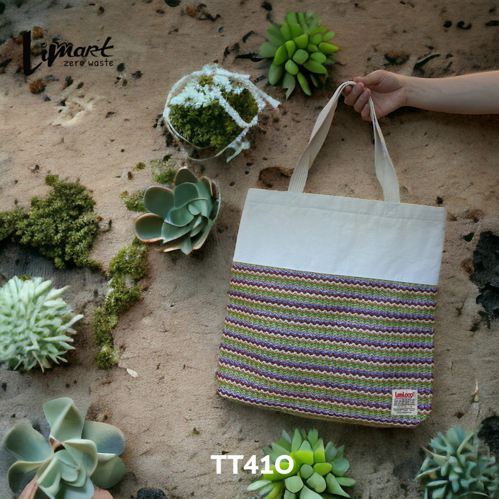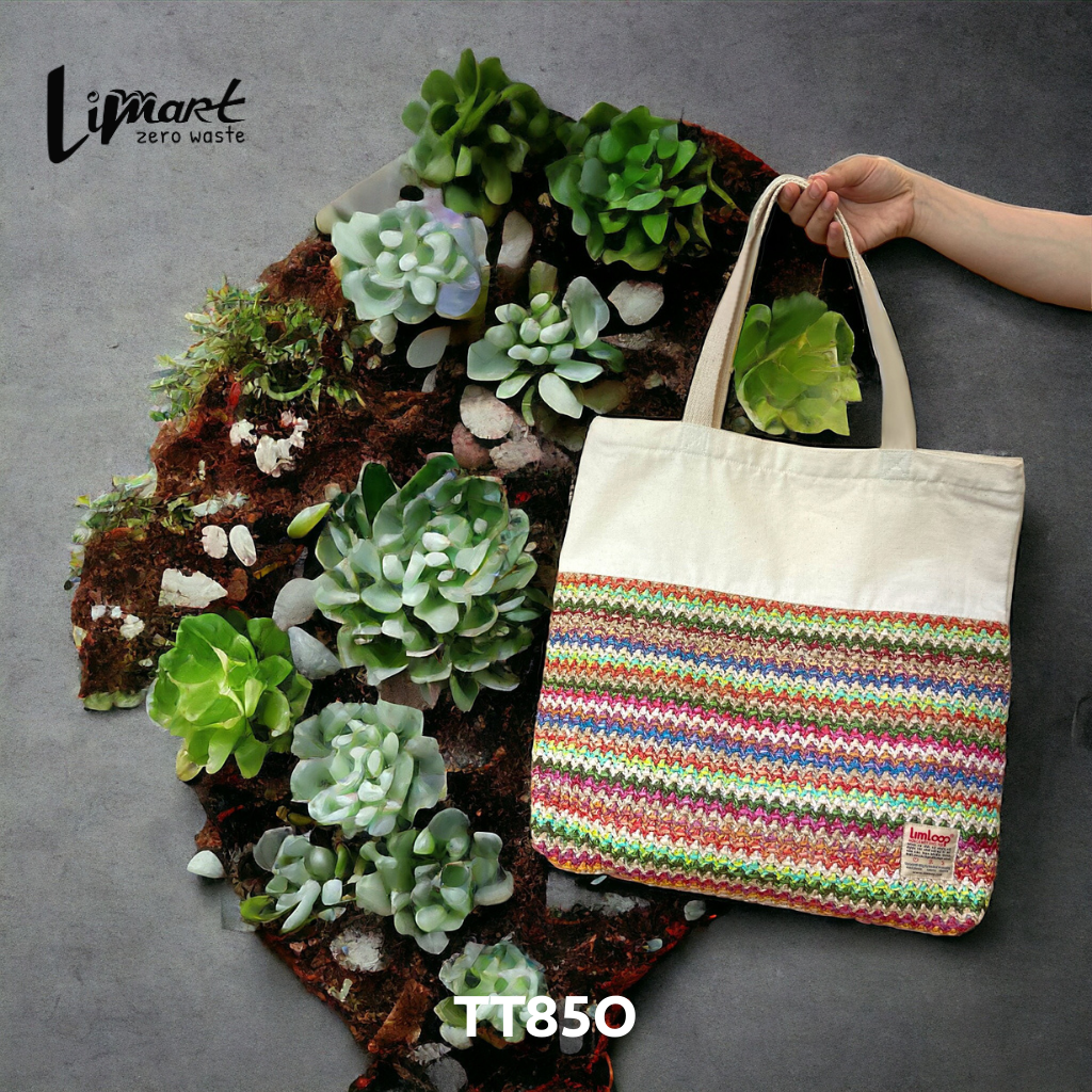 Túi tote dệt của Lim được sản xuất từ 100% túi nilon tái chế, góp phần giảm thiểu rác thải nhựa và bảo vệ môi trường.