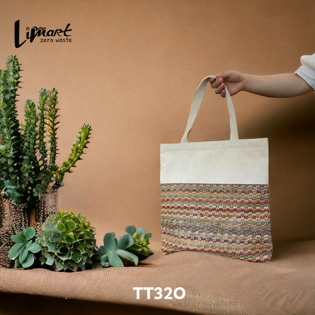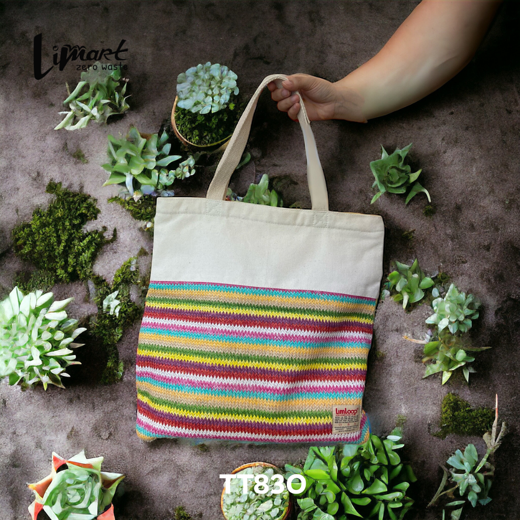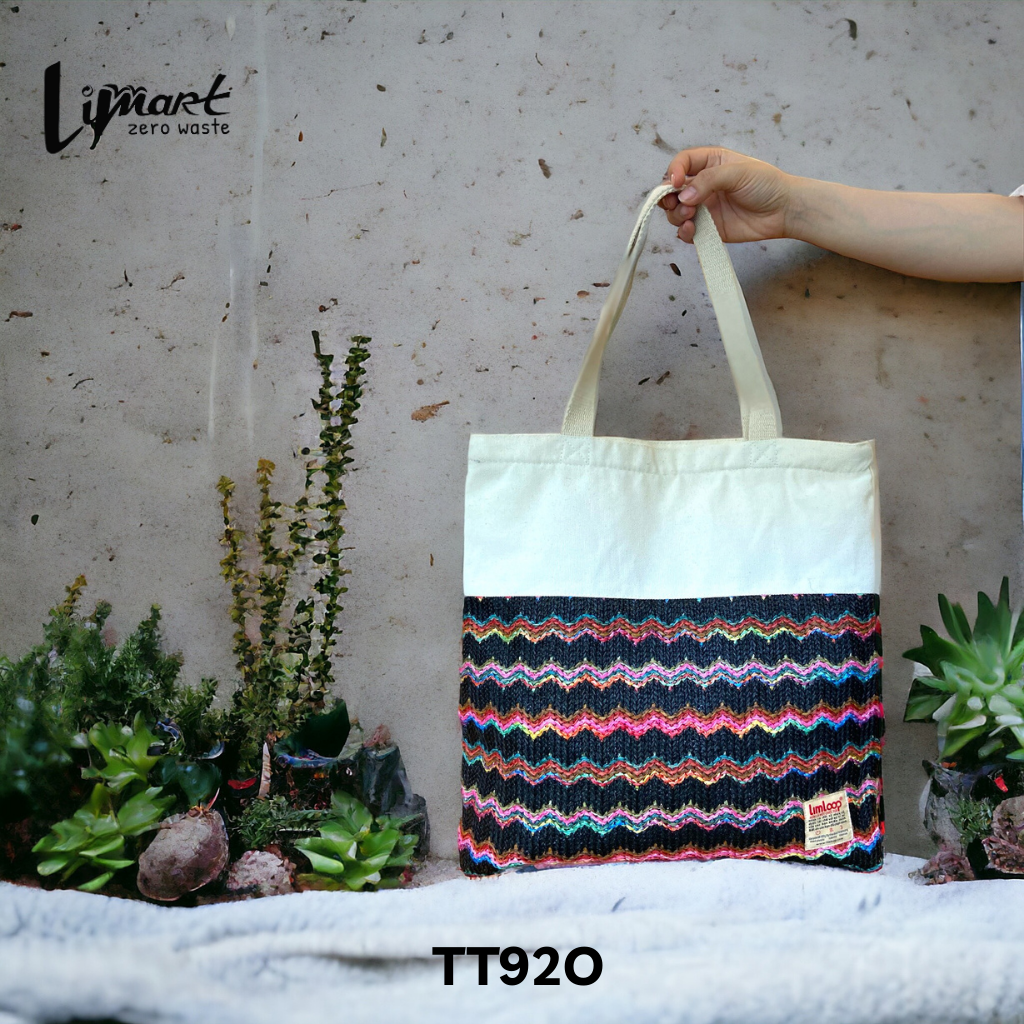 Túi tote dệt của Lim được sản xuất từ 100% túi nilon tái chế, góp phần giảm thiểu rác thải nhựa và bảo vệ môi trường.