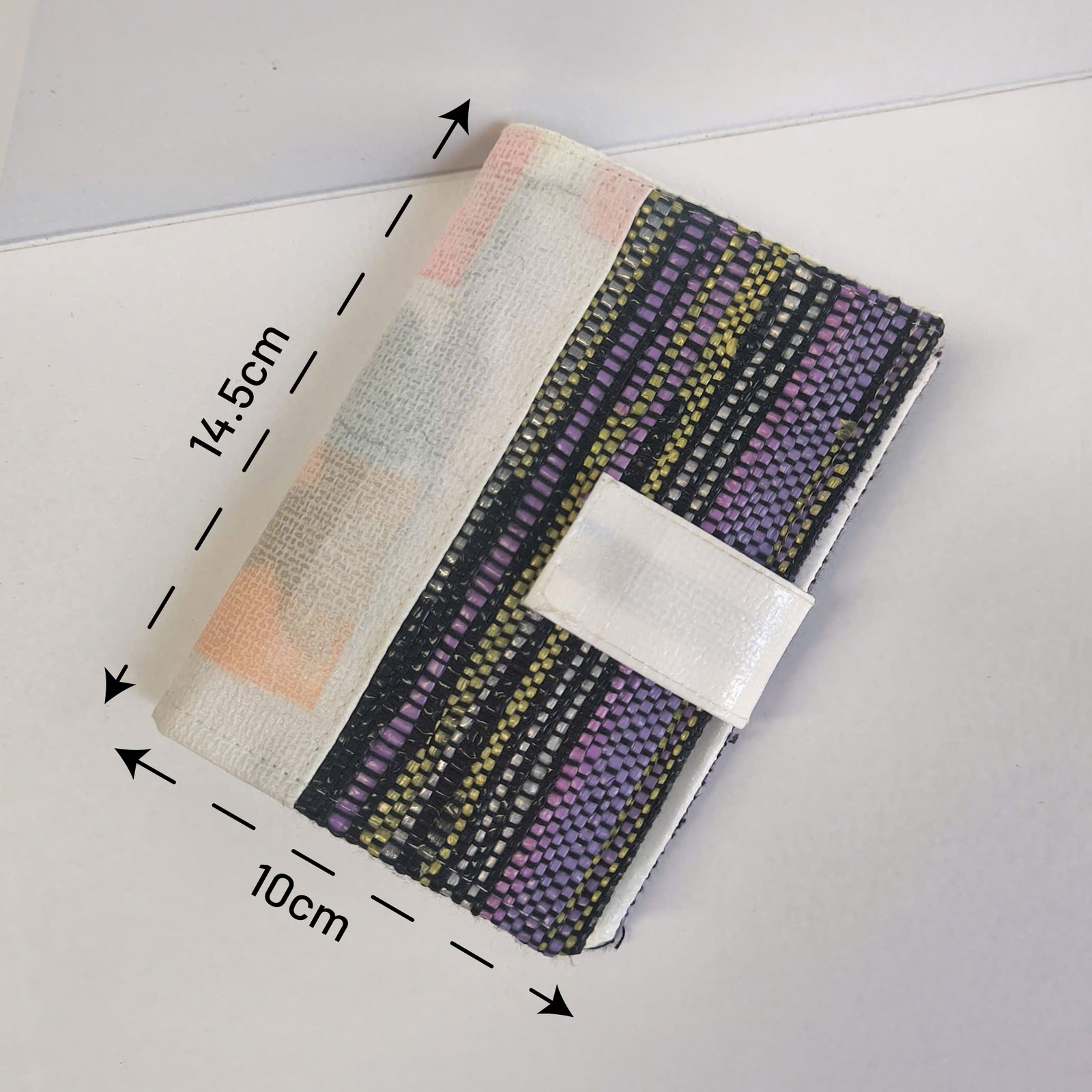* Chất liệu ví được kết hợp từ nilon dệt và nilon ép tái chế, tận dụng túi ni lông đã qua sử dụng để tạo thêm vòng đời mới cho vật liệu.